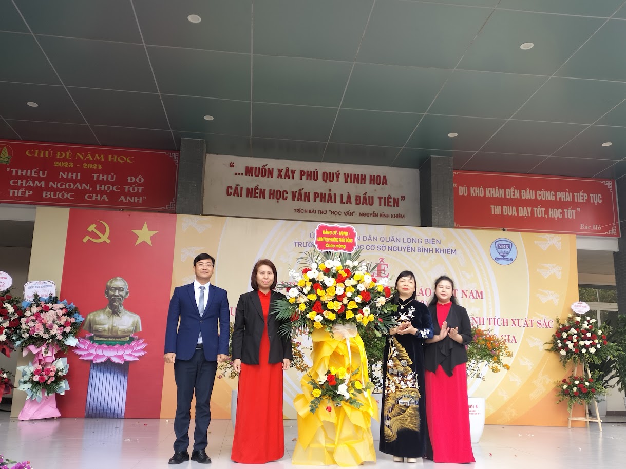 Sau các tiết mục văn nghệ đặc sắc và nghi lễ chào cờ, cô Kiều Thị Hải ôn lại kỷ niệm "Ngày nhà giáo Việt Nam", báo cáo quá trình xây dựng trường chuẩn quốc gia và biểu dương các tập thể, cá nhân GV và HS có thành tích xuất trong năm học 2022 – 2023 và đợt thi đua chào mừng 20/11. Trong năm học vừa qua, trường THCS Nguyễn Bỉnh Khiêm vinh dự được Sở giáo dục và Đào tạo Hà Nội công nhận là trường Chuẩn quốc gia mức độ I, và được UBND quận Long Biên công nhận là Trường học điện tử. Cô giáo Lê Thùy Vân được nhận giấy khen của chủ tịch UBND quận Long Biên về thành tích đạt giải Nhì cuộc thi giáo viên tâm huyết sáng tạo. cô giáo Kiều Thị Hải đã đạt danh hiệu “Gia đình công nhân viên chức lao động tiêu biểu” năm 2023; Thầy Lê Văn Khiêm đạt giải Nhì môn bóng bàn Giải thể dục thể thao cấp Quận. Cô giáo Võ Hương Lam Bí thư chi bộ - HT nhà trường, cô Kiều Thị Hải Phó BT chi bộ - phó HT, cô Nguyễn Thị Thu Thủy chủ tịch công đoàn, cô Nguyễn Thanh Mai, cô giáo Ngô Thị Huyền Ngọc -giáo viên đạt danh hiệu chiến sĩ thi đua cơ sở năm học 2022 – 2023. Cô Nguyễn Thị Thu Hằng đạt danh hiệu phụ trách chi giỏi cấp Quận. Công đoàn trường THCS Nguyễn Bỉnh Khiêm được LĐLĐ quận Long Biên trao giấy khen về thành tích tích cực hưởng ứng phong trào thi đua chào mừng Đại hội công đoàn quận và 20 năm ngày thành lập quận Long Biên. Liên đội THCS Nguyễn Bỉnh Khiêm được công nhận là liên đội xuất sắc cấp Quận năm học 2022- 2023. Tập thể lớp 8A1 nay là 9A1, 8A4 nay là 9A4 đạt chi đội xuất sắc cấp Quận năm học 2022 – 2023. Trong đợt thi đua chào mừng 20/11/2022, nhà trường cũng tuyên dương nhiều tập thể lớp có thành tích xuất sắc trong các phong trào làm báo tập san, văn nghệ, thi đua nề nếp kỉ luật và thi đua giành hoa điểm tốt