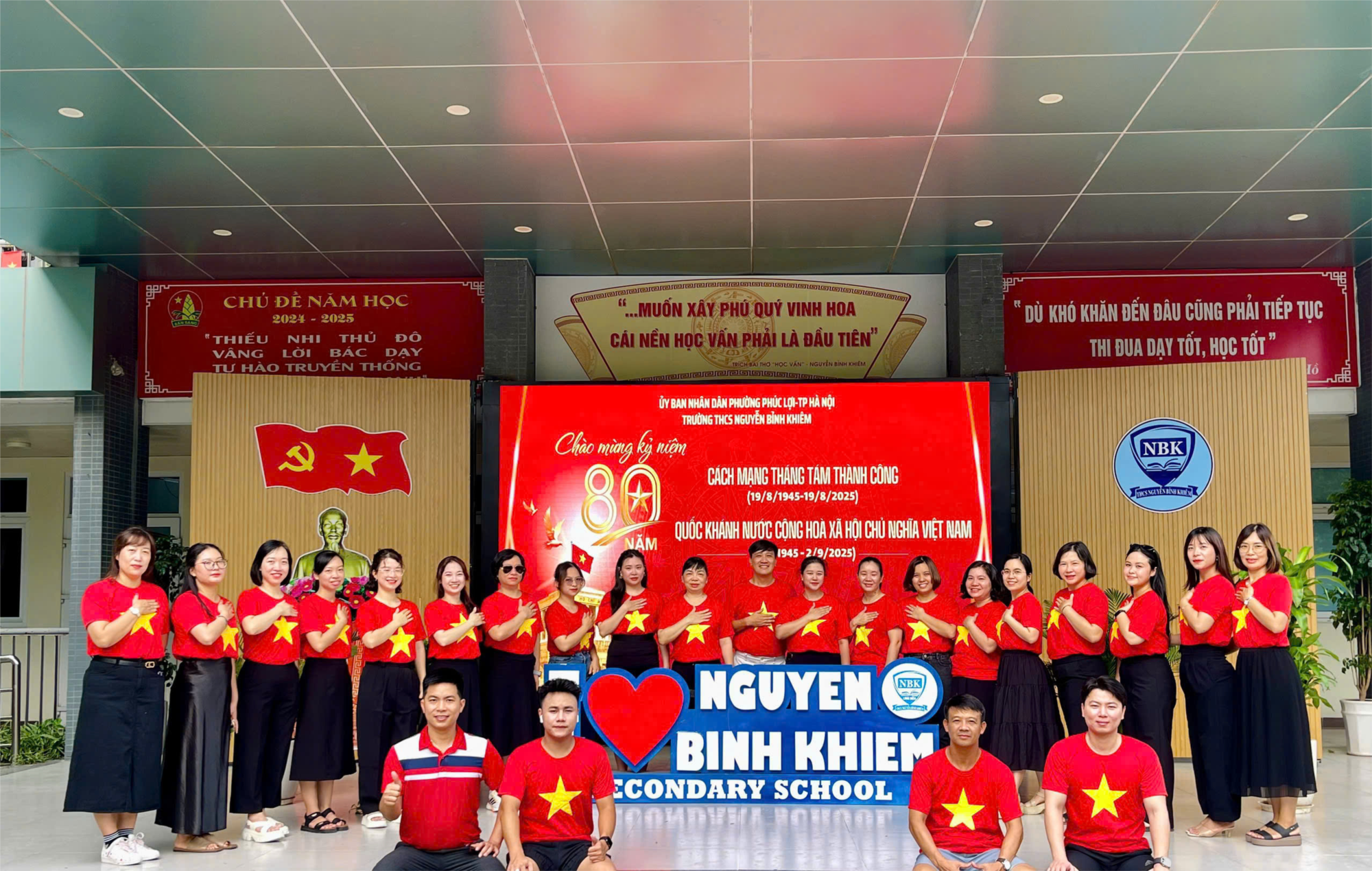 Trong niềm hân hoan ấy, thầy và trò THCS Nguyễn Bỉnh Khiêm cùng nhau dâng trọn tấm lòng: biết ơn công lao trời biển của Bác Hồ kính yêu – Người đã đem lại mùa thu độc lập; tri ân Đảng quang vinh, Nhà nước ta đã dẫn dắt dân tộc qua bao gian khổ để đi đến vinh quang hôm nay; và tự hào được sinh ra, lớn lên trên quê hương đất nước giàu truyền thống anh hùng. Ngày Quốc khánh 2/9 không chỉ là ngày hội non sông, mà còn là ngọn lửa bất diệt sưởi ấm tâm hồn thế hệ hôm nay, nhắc nhở mỗi học sinh biết trân trọng hòa bình, nuôi dưỡng ước mơ, khát vọng và rèn luyện để trở thành những công dân hữu ích, viết tiếp trang sử vàng của dân tộc. Đặc biệt, trong niềm vui hân hoan kỷ niệm 80 năm Quốc khánh, thầy và trò nhà trường cũng hưởng ứng thành công Đại hội Đảng bộ phường Phúc Lợi nhiệm kỳ 2025 – 2030, coi đó là niềm tin, động lực để toàn trường quyết tâm dạy tốt – học tốt, góp phần dựng xây quê hương ngày càng giàu đẹp. Với tất cả niềm tự hào và biết ơn, tập thể THCS Nguyễn Bỉnh Khiêm xin nguyện sống xứng đáng với thế hệ cha anh, không ngừng rèn luyện – sáng tạo – cống hiến cho Tổ quốc, giữ mãi niềm tin son sắt vào Đảng, vào Bác Hồ và vào tương lai tươi sáng của dân tộc. Chào mừng Quốc khánh 2/9 – Mãi mãi một mùa thu độc lập, tự do, hạnh phúc!